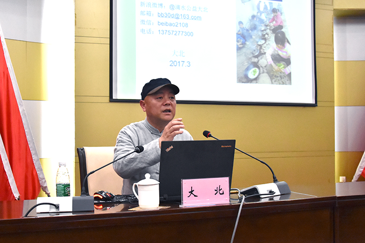 培训中,大北先生围绕“公益慈善与志愿者常识”“公益认知”“公益项目设计要点”三个方面,结合具体案例,对中国慈善事业基本情况、如何设计公益和志愿服务项目、如何开展公益和志愿服务活动、如何增强活动效果等,进行了全面系统的阐释。他以自己长期从事公益事业和志愿服务活动的丰富经历,向与会者传达了包容坚持的处事心态和宽容平和的公益理念,并鼓励现场志愿者们要直面从事公益和志愿服务活动中遇到的困难,咬紧牙关,“撸起袖子加油干”。在最后的现场提问环节,大北先生针对师生提出的有关志愿服务过程中遇到的问题,进行了耐心细致的解答。他以朴实真诚的语言和生动形象的讲述,以及丰富的经验和开阔的眼界,为现场的志愿者们从事公益事业和推进志愿服务活动项目化指明了方向,赢得了阵阵掌声。