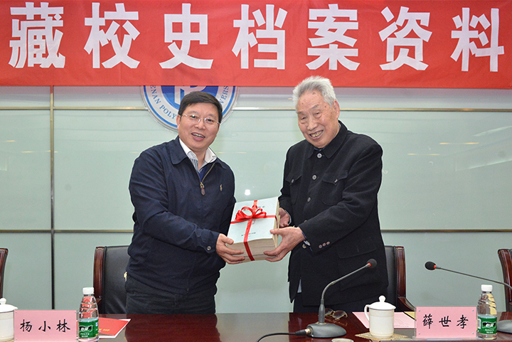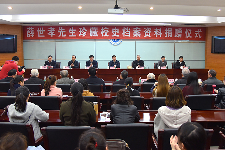 仪式在悠扬激昂的校歌中拉开序幕。仪式上,薛世孝向学校捐赠珍藏的校史档案资料,杨小林代表学校接受捐赠实物并向薛世孝颁发捐赠证书。