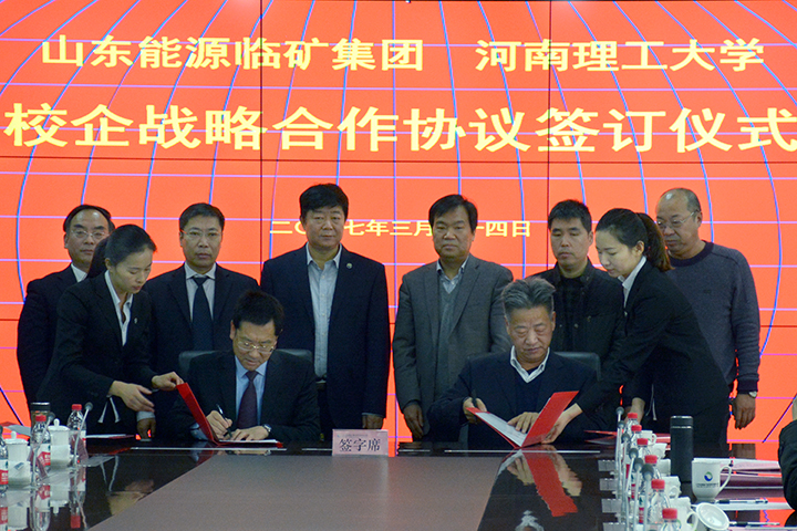 在与会领导和嘉宾的见证下,周英与赵仁乐共同签署了《山东能源临矿集团,河南理工大学校企战略合作协议》。协议指出,双方本着平等互利、优势互补、合作共赢的原则,围绕科研开发、技术服务、成果转化、科技平台建设、人才交流、职工培训、毕业生就业、资源共享等进行战略合作。周英介绍了学校科研情况,以及学校在瓦斯治理、煤层气开发、煤炭开采、软岩支护、三下采煤、矿井防治水、矿山测量、矿山机械、矿山材料、直驱电梯等方面取得的科研成果。他表示,学校将进一步加强与山东能源临矿集团的合作,在科技开发、人才培养、安全培训、毕业生就业等方面全面深化合作关系,通过共同努力,解决企业技术难题,实现双方合作共赢。赵仁乐对周英一行的到访表示热烈欢迎,他介绍了集团公司概况和生产经营情况,希望校企双方加强人才培养和技术领域的交流,实现校企共赢,并要求参会单位重新梳理矿井存在问题,提出整改方案,抓住集团公司转型升级的有利时机,会同学校把脉问诊技术难题,促进集团公司的全面发展。