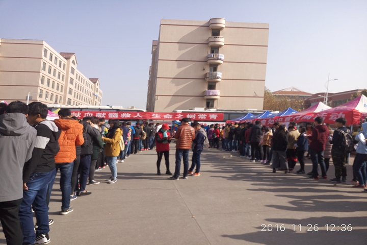 热血是生命的标志,无偿献血是文明进步的标志,11月26至27日,由校团委、焦作市中心血站主办的第十二届“无偿献血宣传周”活动在学苑餐厅东门举行。