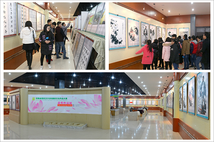 为弘扬廉洁文化,传播廉洁理念,推动高校廉政文化作品创作和传播,近日,河南省高校2016年廉政文化作品大赛获奖作品展在我校明德楼三楼公共艺术教育展厅展出。
