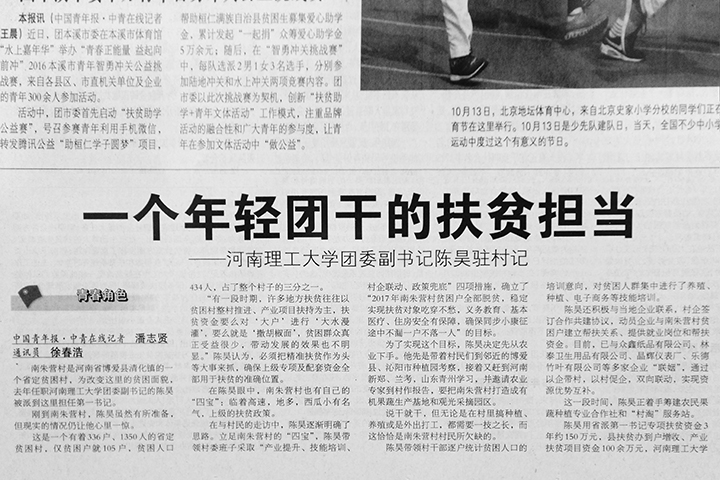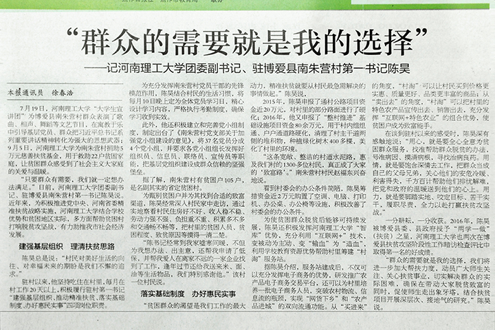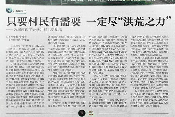 10月17日,《中国青年报》在第8版以《一个年轻团干的扶贫担当——河南理工大学团委副书记陈昊驻村记》为题;10月12日,《河南日报》在第9版头条位置以《只要村民有需要一定尽“洪荒之力”——访河南理工大学驻村书记陈昊》为题;10月12日,《焦作日报》在第6版以《“群众的需要就是我的选择”——记河南理工大学团委副书记、驻博爱县南朱营村第一书记陈昊》为题,报道了校团委副书记陈昊驻村以来,扎根基层带领群众脱贫致富的典型事迹。光明网、中国青年网、中青在线、新浪网、凤凰资讯网、大河网等予以转载。
