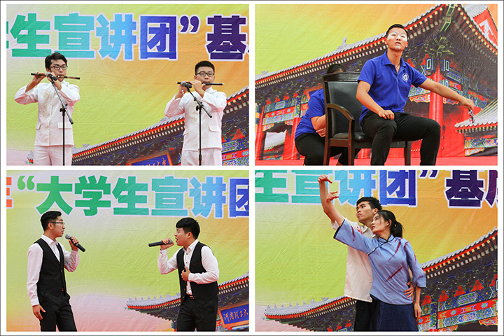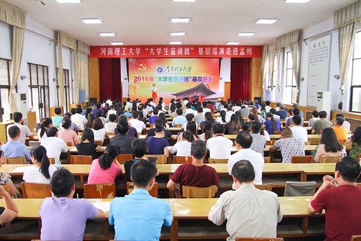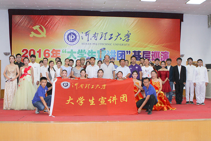 为进一步深化“两学一做”学习教育,扎实开展大学生社会实践活动,7月15日下午,我校“大学生宣讲团”首场基层巡演活动在孟州市精彩上演。巡演活动由省委宣传部、团省委、省教育厅主办,我校承办,焦作市委宣传部、孟州市委宣传部协办。孟州市委宣传部、我校党委宣传部、学生工作部(处)、校团委有关负责同志与当地群众共同观看了演出。