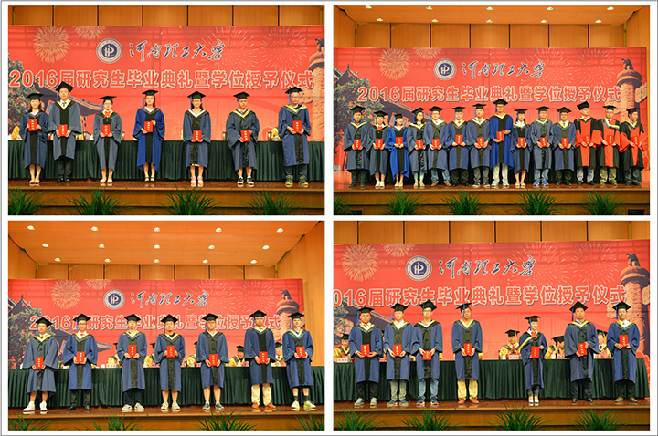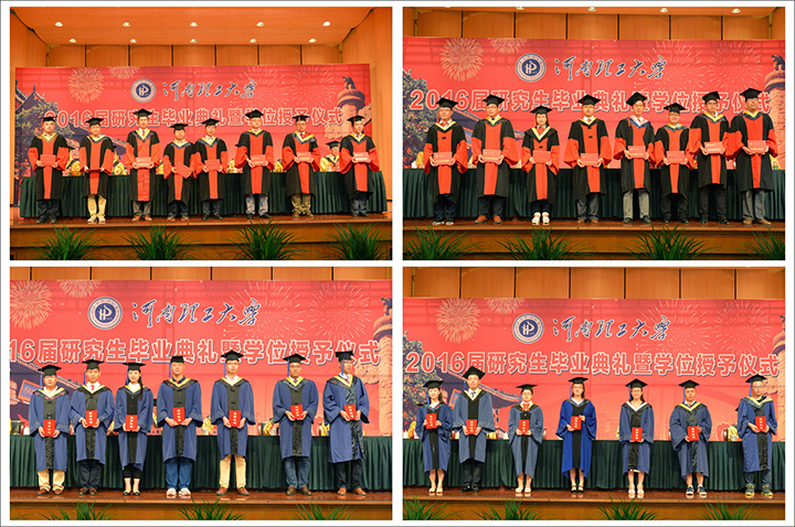 赵俊伟、张锟、卫中玲、周志远分别宣读了授予博士和硕士研究生毕业证、授予硕士研究生学位证、表彰省级和校级优秀毕业生的决定以及优秀学位论文和优秀实践成果评选结果的通知。校领导为2016届博士研究生代表颁发了毕业证书,为2016届省级和校级优秀毕业生、校级优秀博士和硕士学位论文和优秀实践成果奖获得者颁发荣誉证书并合影留念。