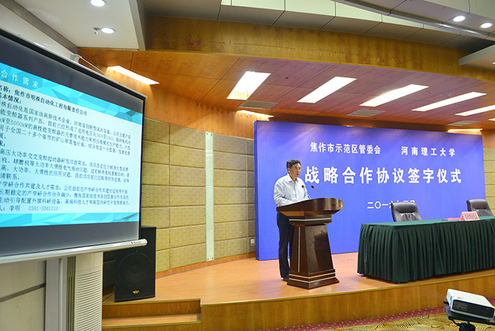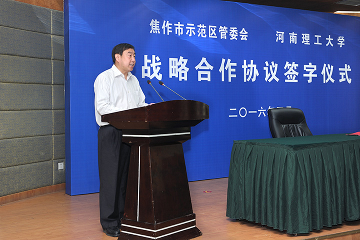 邹友峰在签字仪式上致辞,他代表学校对示范区管委会及辖区各大企业长期以来对我校事业发展的关心、支持表示感谢,并简要介绍了学校的发展历史和办学规模、办学特色和学科优势、人才团队和科研实力等情况。邹友峰指出,学校坚持“立足区域、对接企业、融入地方、服务社会”的办学思路,把支持、服务地方经济社会发展作为义不容辞的责任,在人才培养、科技研发、科技服务和科研成果转化等方面取得了一定的成绩,与示范区建立了长期、良好的合作关系,这次战略合作协议的签署标志着我们与示范区的合作迈上了新台阶。学校将严格履行协议,积极融入地方经济建设,以服务和贡献来开辟自身发展新空间,为加快推动示范区建设发展提供人才保证和科技支撑,为加快推进焦作市中原经济区经济转型示范市建设做出新的更大的贡献!