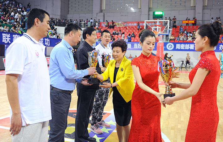 焦作师范专科学校校长张战营为青海师范大学女篮队员马简一颁发MVP荣誉奖杯