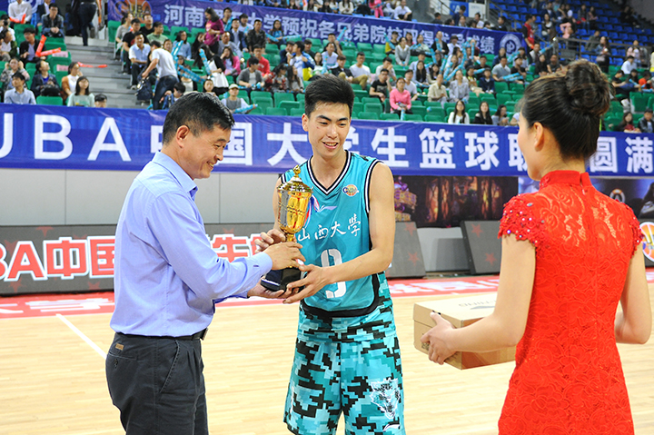 副校长赵俊伟为山西大学男篮队员陈凯涛颁发MVP荣誉奖杯