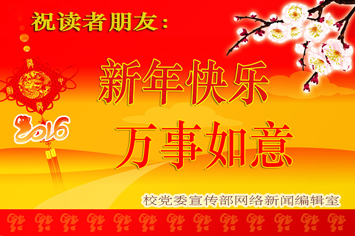 辞旧岁三羊开泰汇聚中华正能量,迎新春金猴舞棒展现和谐中国梦。送别和谐美好的2015,我们迎来了阳光灿烂的2016。值此辞旧迎新之际,校党委宣传部网络新闻编辑室向长期以来关心和支持学校新闻网的各级领导、海内外校友和全校师生员工致以新年的问候和诚挚的祝福!向所有为学校新闻网建设和发展做出努力的广大作者和读者朋友表示崇高的敬意和衷心的感谢!