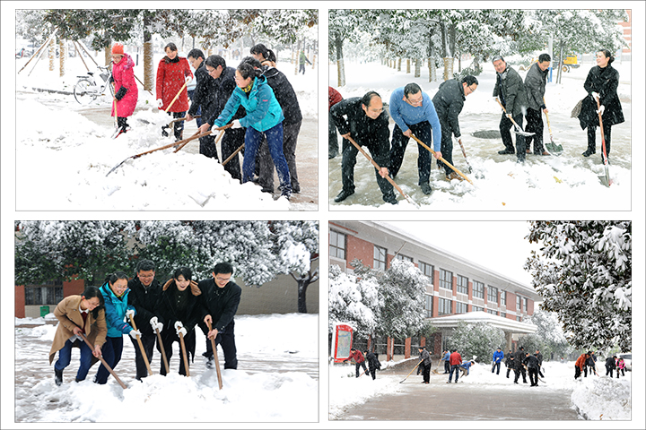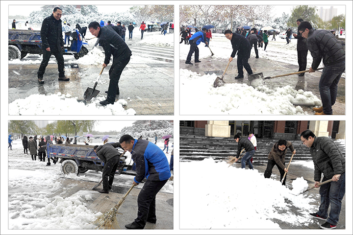为及时清除冰雪,今天一大早,邹友峰、周志远、卫中玲、周英、张锟、赵俊伟、张尚字、解伟等校领导和广大机关干部一起,拿起铁锨、扫帚,在行政楼、明德楼、力行楼前扫的扫,铲的铲,全然不顾严寒,积极清除积雪。经过一个多小时的奋战,三栋办公楼前的积雪基本清扫干净。
