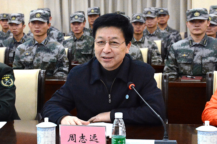 周志远发表讲话。他代表校党委、行政以及全校师生员工对参加会议的军队领导、毕业国防生校友的到来表示热烈欢迎,总结、回顾了学校国防生培养工作十年来取得的成绩和经验,指出国防生群体以坚定的政治思想素质、扎实的专业成绩、严明的作风纪律和出色的现实表现,成为学校一道靓丽的风景线,成为学校模范践行“学风”“校风”的标杆和榜样;毕业国防生在军队各个岗位上,以务实、重干的工作精神,以思想坚定、素质全面的品质赢得了部队官兵认可,以创新、扎实的工作能力为军队现代化建设作出一定的贡献,为母校赢得了荣誉。最后,他祝福国防生校友生活美满、事业有成,希望他们一如既往地关心和支持母校的发展。