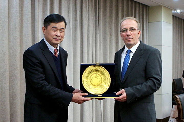 阿尔罕·乌尊(右)向副校长赵俊伟赠送礼品