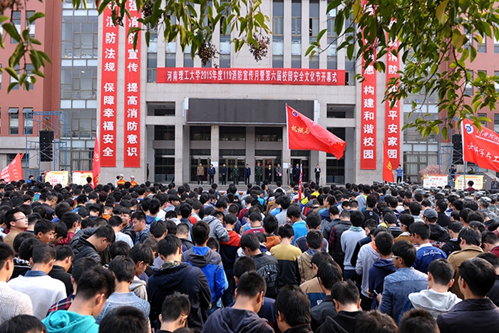 11月3日下午,2015年119消防宣传月暨“第六届校园安全文化节”开幕式在3号教学楼前举行。副校长翟传森出席开幕式并宣布“2015年‘119’消防宣传月暨‘第六届校园安全文化节’开幕”。焦作市公安消防支队副支队长武伟,焦作市防火监督处处长梁清水出席开幕式。仪式由保卫部部长娄平仁主持。