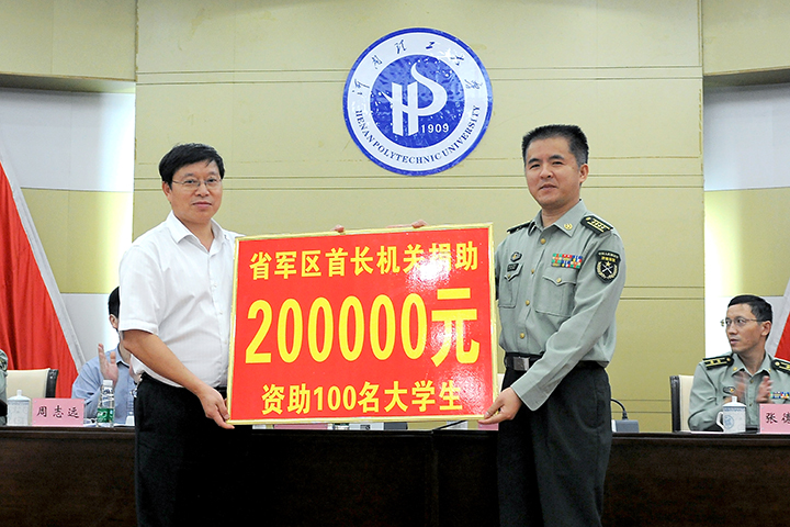 军民共建惠施万家,助学兴教功利千秋。9月29日下午,“河南省军区首长机关助学金捐赠”仪式在学校力行楼学术报告厅举行。省军区政治部副主任李小平、省军区战勤处处长张德炯、省军区直工处副处长李发扬、河南理工大学校长杨小林、校党委副书记周志远出席捐助仪式,学校相关职能部门负责同志和部分师生代表参加捐助仪式。会议由周志远主持。