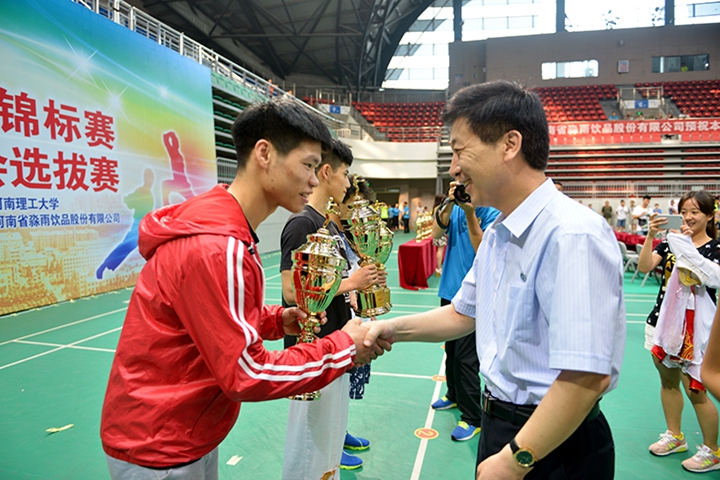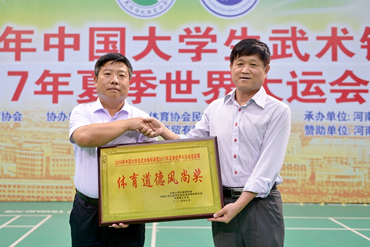 中国大学生体育协会民族传统体育分会副主席瞿荣良,中国大学生体育协会民族传统体育分会副秘书长李绍成,本届赛事仲裁委员会主任李永明,中国大学生体育协会民族传统体育分会副主席、学校党委副书记周志远,河南省淼雨饮品股份有限公司总经理韩健华为获奖运动队颁奖。中国大学生体育协会民族传统体育分会秘书长、跆拳道体育分会秘书长苏长来为我校颁发“特殊贡献奖”。