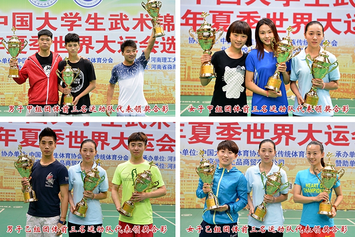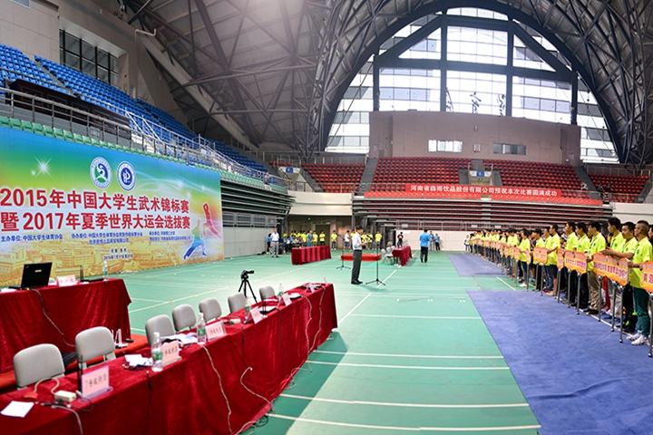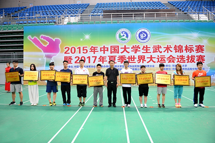 7月21日下午,2015年中国大学生武术锦标赛暨2017年夏季世界大运会选拔赛在我校体育馆圆满落幕,并决出男子甲组团体、女子甲组团体、男子乙组团体、女子乙组团体冠军,其中天津理工大学工商管理队包揽男子甲组团体、女子甲组团体冠军,男子乙组团体、女子乙组团体桂冠分别被兰州大学、北京体育大学摘得;上海中医药大学等11支运动队、金龙等10名裁判员、侯敬薇等58名运动员荣获“体育道德风尚奖”;我校荣获“特殊贡献奖”。