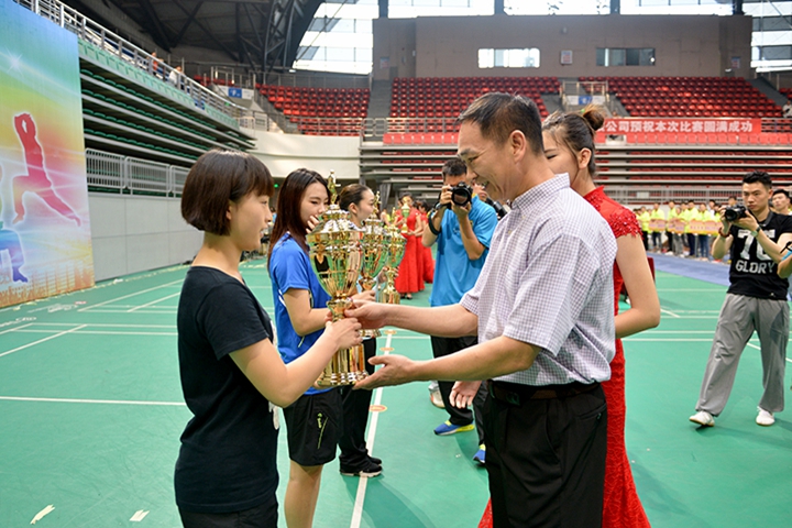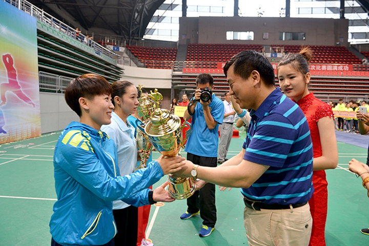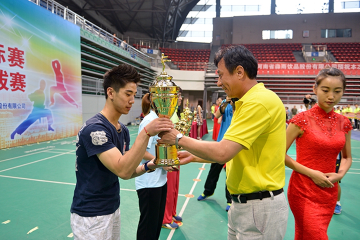 河南省淼雨饮品股份有限公司总经理韩健华为荣获女子乙组团体前三名运动队颁奖