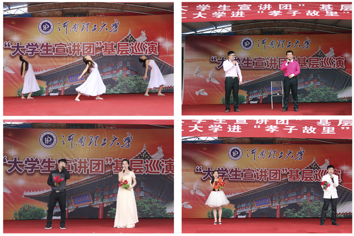 为培育和践行社会主义核心价值观,推进大学生社会实践活动深入开展,7月16日下午,河南理工大学“大学生宣讲团”首场基层巡演活动在“孝子故里”——焦作沁阳市崇义镇后杨香村精彩上演。沁阳市市委外宣办主任杨吉,崇义镇党委副书记、镇长李小林,校党委宣传部、校团委有关负责同志与当地群众共同观看了本次演出。
