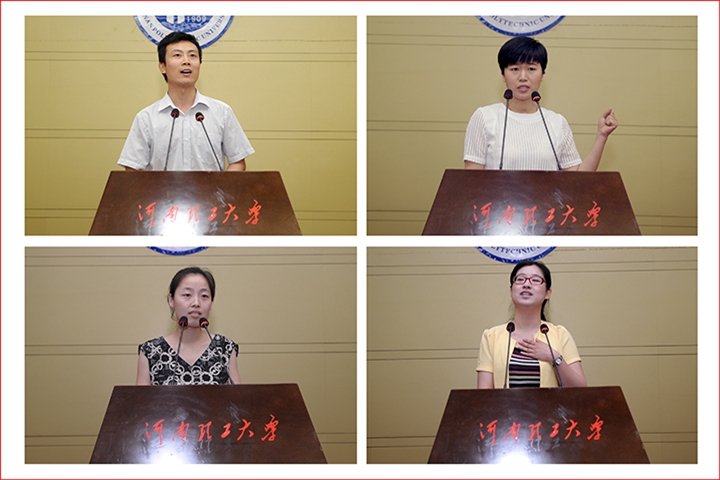经过激烈的角逐,万方学院孔珊珊获一等奖,校团委孙小婷、机械学院吕宝占获二等奖,计算机学院闪烁、图书馆陈蕾、理化学院李慧军获三等奖,外国语学院杜钦、数信学院王丽、建艺学院陈静、建艺学院金欢、机械学院路好、经管学院杨云松六名老师获优秀奖。朱雪里、郭健卿、沈记全、侯菊英分为荣获一等奖、二等奖、三等奖、优秀奖的选手颁发证书并合影留念。