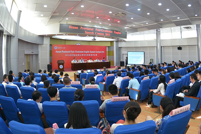 5月14日上午,2015年河南省硕士研究生英语演讲比赛在力行楼学术报告厅开幕,省教育厅学位管理与研究生教育处处长贾正国、调研员曹克舜、副调研员刘慧玲,我校副校长周英出席开幕式,研究生处处长赵同谦和担任比赛评委的7位国内外教授、专家和来自全省21所高校选手和指导教师参加开幕式。开幕式由刘慧玲主持。