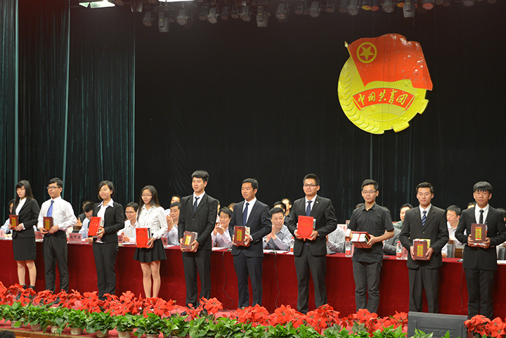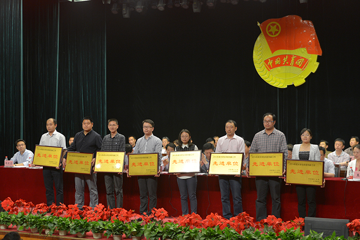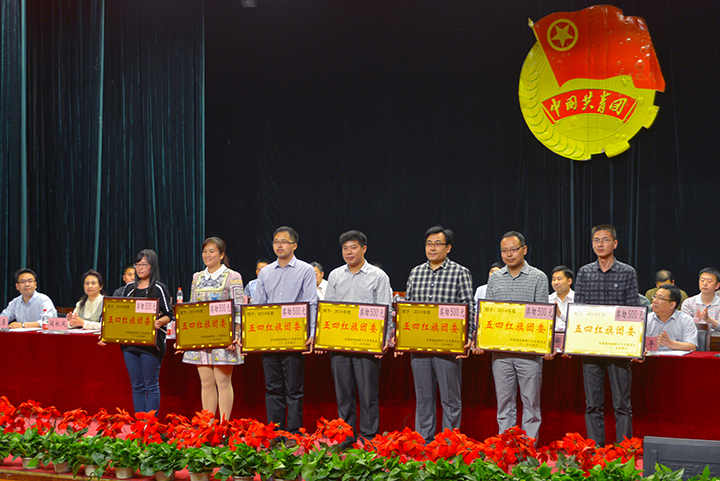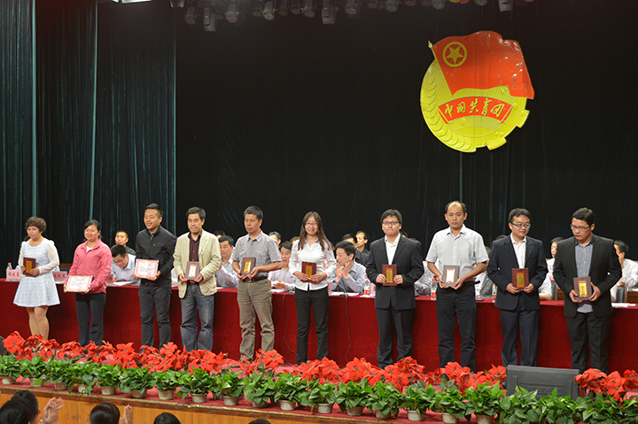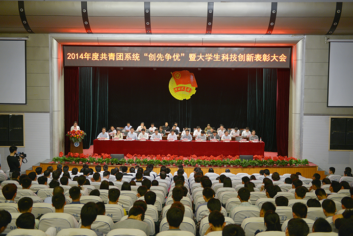 表彰大会在庄严的国歌声中拉开序幕。大会表彰了2014年度共青团系统“创先争优”活动先进集体和先进个人,公布了2014年度大学生科技创新工作评奖结果。与会领导为受表彰的先进单位和个人颁奖。