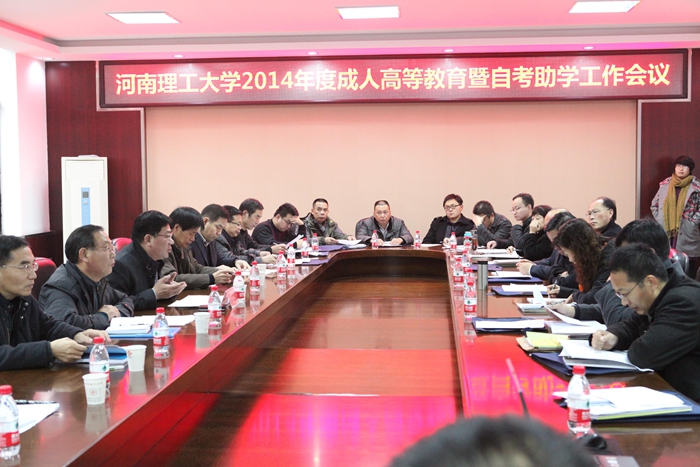 成教学院院长王宝山作了题为《以评促建,规范办学,努力推进我校成人教育稳步发展》的工作报告,他介绍了成教学院2014年的主要工作和目前形势与面临的问题,并从四个方面提出了2015年的主要工作任务,一是认真做好函授站检查评估工作;二是加大招生宣传,稳定成人教育规模;三是加强管理,全面提高成人教育教学质量;四是加快成人教育教学管理信息化、网络化建设。随后,副院长黄小广就河南省教育厅2015年函授站检查评估和清理整顿工作作了安排布置;副院长任长江宣读了《河南理工大学关于表彰2013年度成人学历教育先进集体和先进个人的决定》。