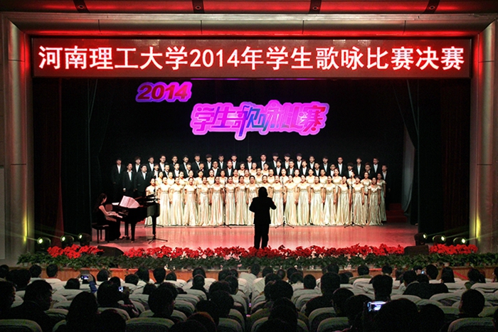 飞扬的歌声唱响难忘岁月,熟悉的旋律传递感恩情怀。为提升学生的文艺素养和表演才能,丰富学生业余生活,培养学生集体主义责任感、荣誉感,促进相互之间的了解与交流,11月15日晚,由校团委牵头组织的“河南理工大学2014年学生歌咏比赛”决赛在我校小礼堂拉开帷幕。校党政领导王少安、邹友峰、周志远、张锟、景国勋出席并为获奖单位颁奖。学校各职能部门、各学院负责人和千余名师生观看了比赛。