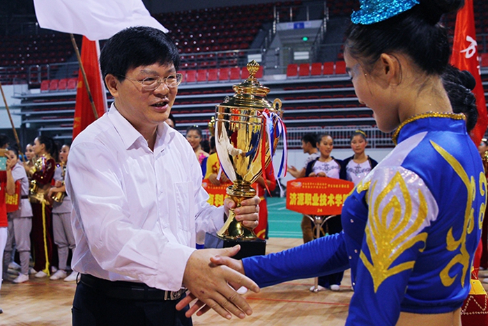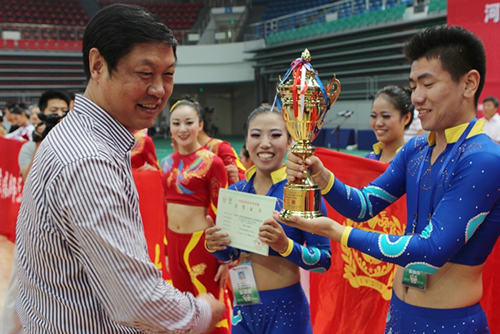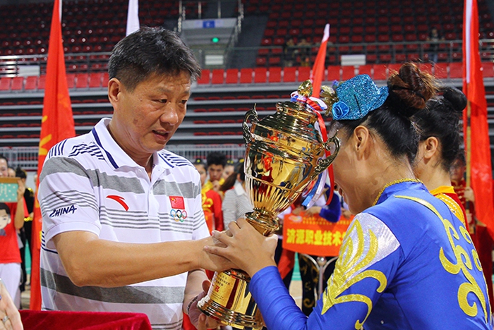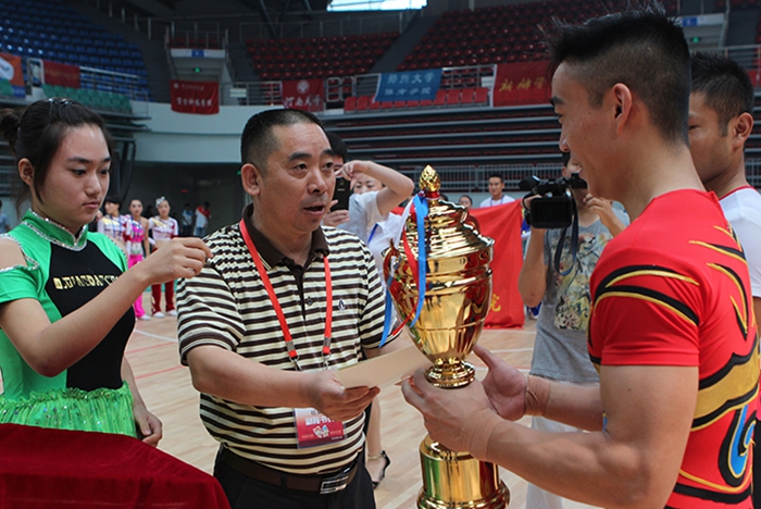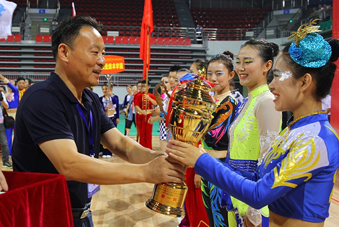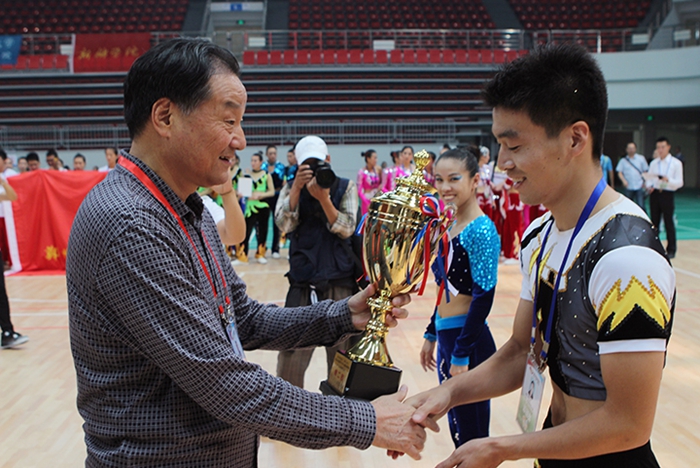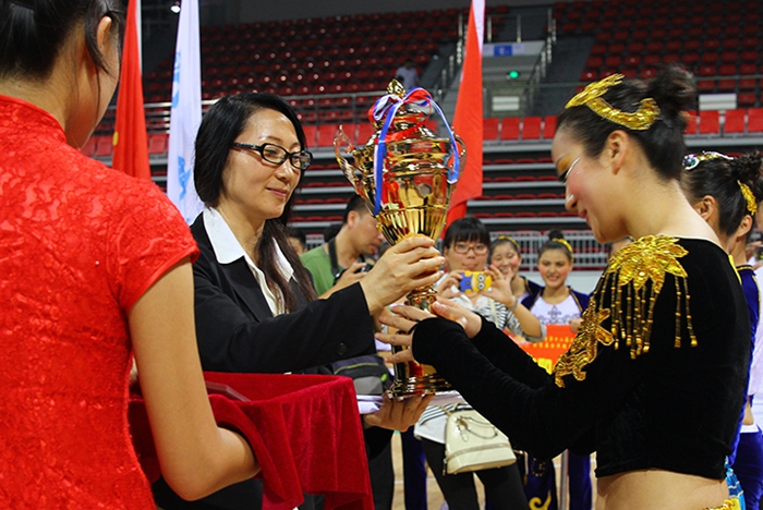 省学生体育总会健美操协会秘书长、健美操国际级裁判李亚楠为获奖运动队代表颁奖
