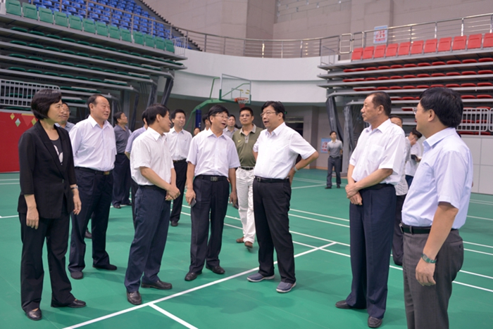 随后,张广智一行进入学校体育馆视察。当了解到体育馆的面积、功能、建设质量上乘和建筑风格也独具特色时,对学校高度重视体育工作给予充分肯定。他希望学校配合当地政府,扎实做好各项准备工作,高水准承办好省运会相关项目,为发展全省体育事业作出贡献。陪同视察的学校领导表示一定高度重视,全力以赴,为第十二届省运会的成功举办扎实工作,让省委省政府和全省人民放心。