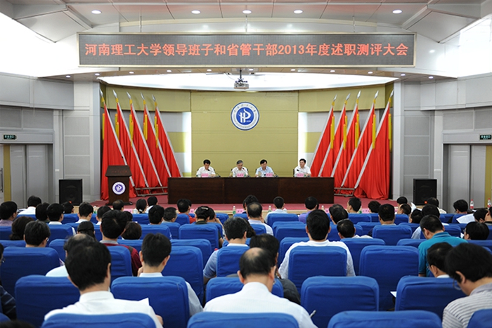 7月8日上午,学校领导班子和省管干部2013年度述职测评大会在力行楼学术报告厅召开。省委第四考核组组长仉建涛,副组长李海现和考核组全体成员出席会议。校党政领导王少安、邹友峰、张国臣、周志远、卫中玲、张锟、景国勋、杨建堂,原副校长王裕清、原校长助理丁安民和各界代表、中层正职、具有博士学位的正高职称人员参加会议。会议由王少安主持。