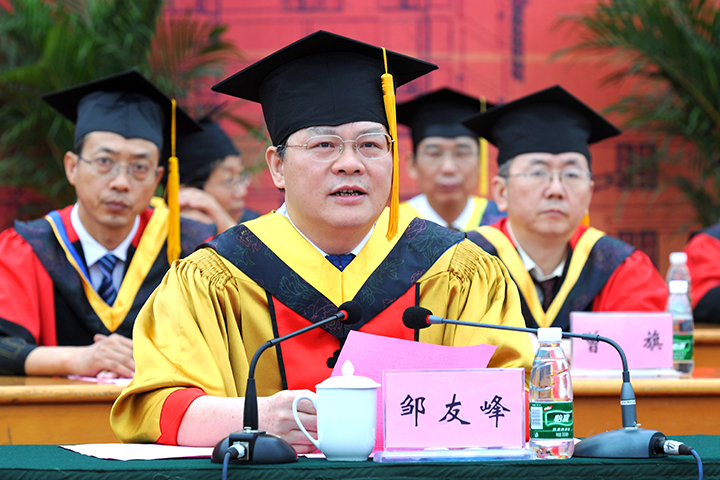 邹友峰发表讲话。他首先代表学校和全校师生向圆满完成学业、即将踏上崭新人生旅程的2014届毕业生表示热烈祝贺,向为学校教育教学工作付出辛勤劳动的广大教职工表示敬意。接着,深情回顾了2014届毕业生的成长历程及学校发展取得的长足进步。邹友峰殷切寄语2014届毕业生:一要处理好理想与现实的关系,永怀报国之志。期望同学们时刻牢记“明德任责”校训,将崇高理想与实干精神联系起来,志存高远、勇于担当,勤奋努力、甘于奉献。在实践中历练自我、完善自我、超越自我,不迷失、不放弃,最终实现自己的人生价值。二要处理好继承和创新的关系,永葆进取之心。期望同学们牢固树立终生学习的理念,继续践行“好学力行”校风,勤于思、敏于行,结合工作实际,不断探索新知。传承优秀民族文化,广泛涉猎人类文明成果,培养创新思维和创新能力,始终奋进在时代前列。三要处理好律己和待人的关系,常怀感恩之情。正确处理人际关系,严格要求自己,不断完善自我,做到自尊、自省、自警,常怀敬畏和感恩之心。知荣辱、懂进退,做到敏捷而不浮躁,广博而不轻狂,书写自己的优雅人生、光彩人生。四要不忘母校,以自己的人生华章,为母校增光添彩。希望同学们坚守“今天我以理工大为荣,明天理工大以我为荣”的理念,拼搏进取,开拓创新,继续支持母校,关心母校,在为国家做贡献,为自己争荣光的同时,也为母校增光添彩。