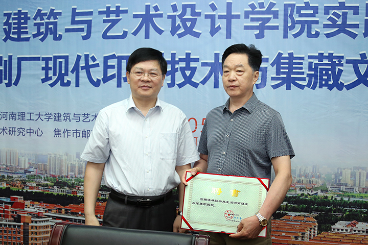 校长邹友峰为河南省邮电印刷厂副厂长李剑颁发兼职教授证书