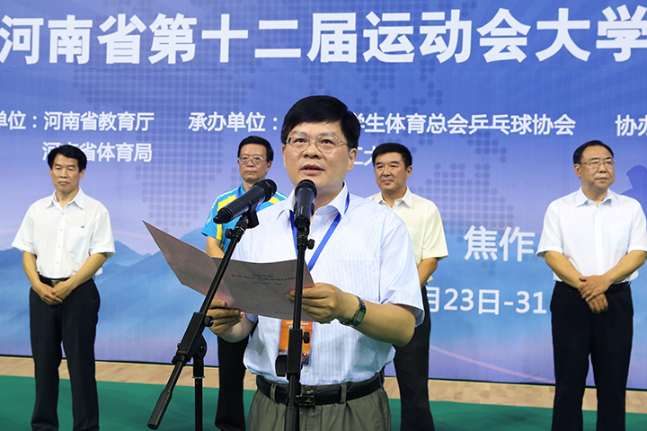 河南省教育厅副厅长刁玉华,焦作市人民政府副市长李海松,河南省教育厅体卫艺处处长郭蔚蔚,河南省学生体育总会副主席、乒乓球协会主席白威凉,学校党政领导王少安、邹友峰、张国臣、周志远、卫中玲、张锟、景国勋出席开幕式,来自省内35所高校的250余名校领导及学校相关部门负责同志参加了开幕式。开幕式由郭蔚蔚主持。