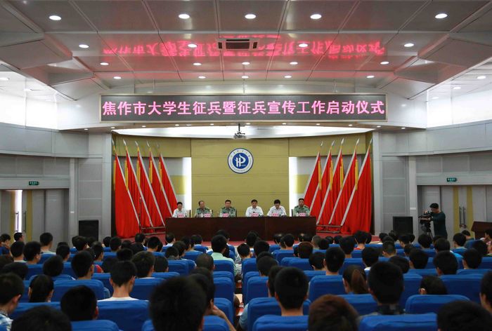 5月13日下午,焦作市大学生征兵暨宣传工作启动仪式在我校圆形报告厅举行。焦作市征兵领导小组组长、焦作市副市长贾书君,焦作军分区司令员杨文耀,校党委副书记周志远、副校长景国勋等出席仪式,焦作市各县(区)及相关单位、辖区各高等院校征兵工作负责人和我校部分学生参加了仪式。