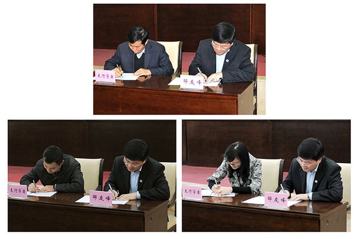 副校长周英宣读了首批“太行学者”名单。首批“太行学者”共30位,其中一级“太行学者”2人,分别为张玉贵、李化敏,二级“太行学者”13人,三级“太行学者”15人。在欢快的乐曲声中,校长邹友峰与“太行学者”代表签订聘任协议。王少安、邹友峰等与会校领导为“太行学者”颁发聘书。