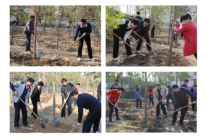 为积极响应省、市委美丽河南、美丽焦作建设号召,进一步加快校园绿化进度。植树节期间,校党政领导王少安、张国臣、周志远、卫中玲、张锟、景国勋、杨建堂与党委办公室、校长办公室、组织部、宣传部、后勤管理处、后勤集团公司等职能部门负责同志、职工来到2014年重点绿化地段三号教学楼南侧林地开展义务植树活动。