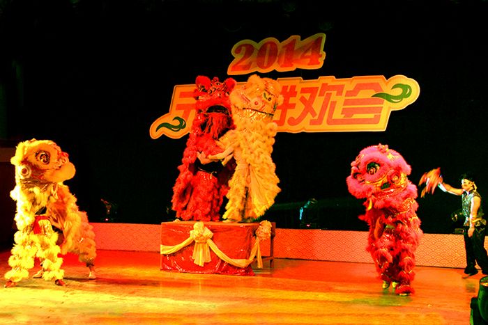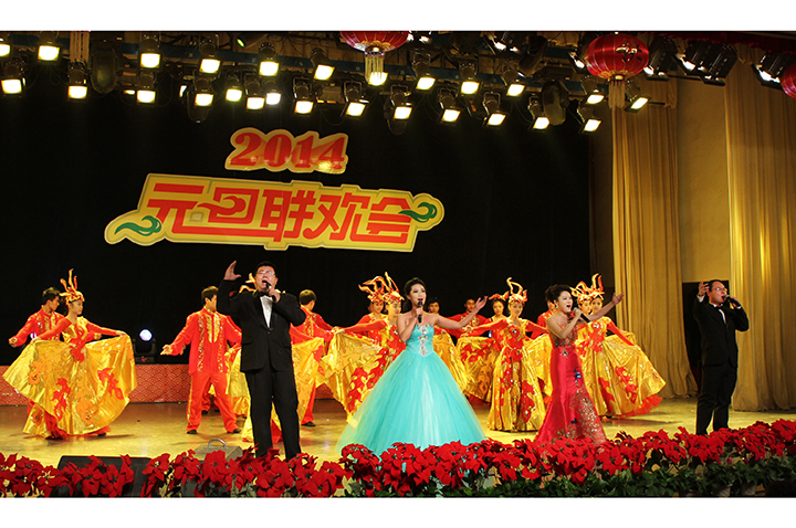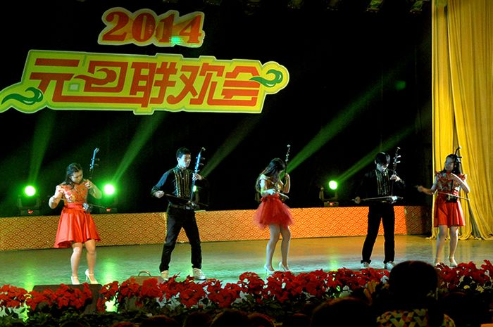 激情欢庆的音乐响彻礼堂上空,生龙活虎的《雄狮闹新春》拉开晚会帷幕。一首高亢的《红旗飘飘》,激荡着莘莘理工学子的爱国情怀。二胡合奏《春节序曲》、《铃儿响叮当》、《奔驰在千里草原》展现了亿万中华儿女正伴着铃儿响叮当和奔驰在千里草原上的畅快心情,奏响2014春节序曲。一段藏舞与踢踏结合的《高原情》向观众们展示了节日高原的壮美与活力。几位美丽的韩国和哈萨克斯坦的留学生倾心打造的舞蹈《what’s your name》,激情洋溢,在缤纷闪烁的灯光效果下,舞者抬腿,迈步,旋转,摇摆,宛若踏着音符跳动的精灵,获得观众经久不息的掌声。附属小学的小朋友们带来的情景剧《小猪三兄弟》为晚会带来了阵阵欢笑,增添了几分童趣和纯真。世间万物,因和谐而变得完美,人间真情,因和谐而变的温馨,歌舞《和谐圆舞曲》激起了观众们心中的和谐涟漪。国家梦、民族梦、个人梦共同凝成我们伟大的中国梦,诗朗诵《中国梦·理工梦》道出了每个人的心声,凝聚中国力量,用青春共创精彩人生。从昔日的焦作路矿学堂走到今日的河南理工大学,理工人一步一个脚印,走的踏实坚定,快板《印象理工》再现了建校辛苦奋斗历程和如今辉煌成就。中华武术博大精深,百年理工谁与争锋,武术《谁与争锋》展现了理工学子的铮铮铁骨。最后,晚会在歌舞《举杯吧朋友》中完美谢幕。整场晚会以“喜庆、祥和、高雅”为基调,融合器乐演奏、合唱、舞蹈等丰富多彩的节目,集娱乐性、欣赏性于一体,为全校师生献上了一场美轮美奂的视觉盛宴,现场掌声不断,高潮迭起。