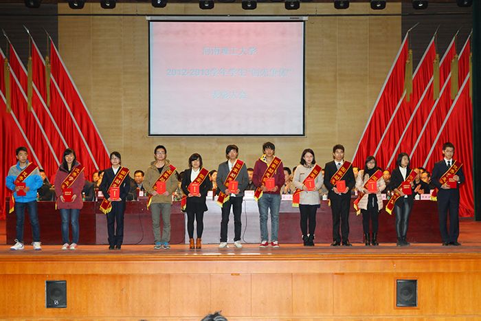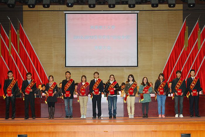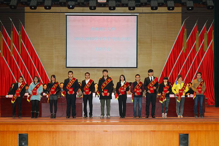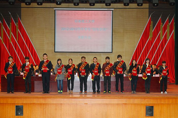 会议在庄严的国歌声中拉开序幕。会上,副校长卫中玲宣读了获得2013年度国家奖学金、国家励志奖学金、2013年度河南省先进班集体、省三好学生、省优秀学生干部名单;副校长张战营宣读了关于2012—2013学年学生“创先争优”活动先进集体和先进个人的决定及河南理工大学关于表彰2012—2013学年文明班级、文明宿舍、文明学生的决定;副校长张锟宣读了2012—2013学年河南理工大学关于“孙越崎优秀学生奖”、“采矿工程英才奖学金”、“九鼎科技奖学金”的表彰决定。随后,校领导、校友代表为获奖的先进集体和先进个人代表颁奖。先进个人和先进集体代表分别发言。