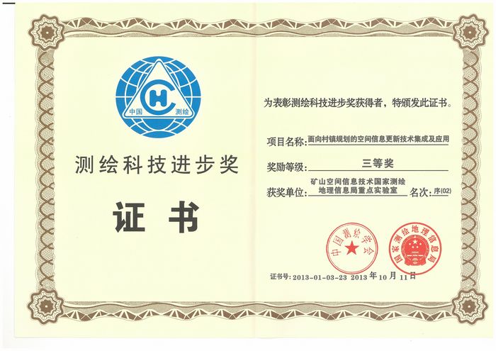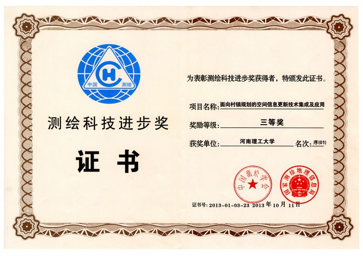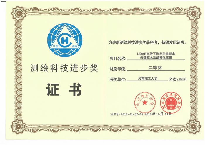 10月11日在北京召开的中国测绘学会2013年综合学术年会上传来喜讯,由河南理工大学矿山空间信息技术国家测绘地理信息局重点实验室与河南省测绘工程院共同完成的“LiDAR支持下数字三维城市关键技术及规模化应用”项目荣获2013年测绘科技进步二等奖,河南理工大学测绘学院与矿山空间信息技术重点实验室共同完成的“面向村镇规划的空间信息更新技术集成与应用”荣获三等奖,这是河南理工大学测绘学科及矿山空间信息技术国家测绘地理信息局重点实验室连续三年获得国家测绘科技进步奖励。