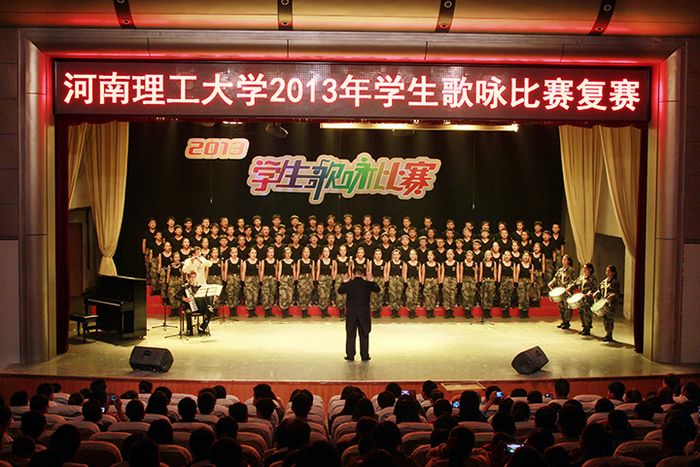 泱泱中华壮谱雄浑乐章,理工学子唱响爱国情肠。10月19日至20日晚,2013年学生歌咏比赛复赛在我校小礼堂拉开帷幕。担任此次比赛的评委有:中国音乐家协会会员、河南省音乐家协会理事、男高音歌唱家、音乐学院院长李新现,中国音乐家协会会员、焦作市音乐家协会副主席兼秘书长梁文革,焦作市合唱协会副主席、青年指挥家、音乐学院合唱教师马安平,中国音乐家协会奥尔夫专业委员会委员、女高音歌唱家、焦作师专教师孟娟,河南省音乐家协会会员、郑州信息科技职业学院音乐系副主任李海安,焦作师专合唱指挥教师张伟以及我校团委老师薛茜。校团委、学生处等相关职能部门负责人和千余名师生共同观看了本场比赛。