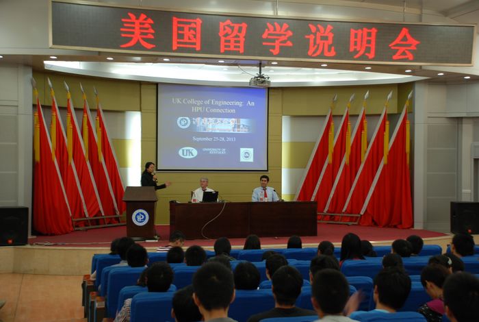 26日下午,G.T和K.C博士在圆形报告厅为学校师生举办了肯塔基大学留学说明会。介绍了肯塔基大学的地理位置、教学研究设施、教师管理人员、入学申请程序、学习费用、奖学金、学位授予等情况,以及肯塔基大学的学生组织、就业服务和该校学生的就业优势、学习方法、与学校的合作协议内容等。说明会持续两个多小时,内容丰富,气氛热烈,开阔了大家的视野,得到了师生的欢迎和好评。
