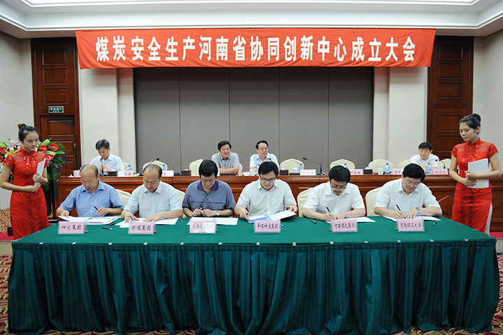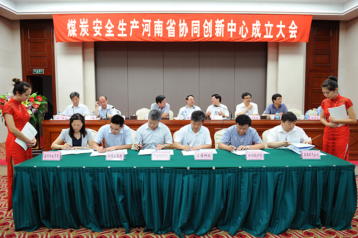 按照议程,中心管理委员会主任邹友峰首先汇报了协同创新中心的组建和培育情况,并向大会通报了中心第一次理事会主要内容。张水潮代表上级主管部门向中心的成立表示祝贺,同时宣读了中心首批四个重大科技攻关项目。随后,中心成员单位共同签署了《煤炭安全生产协同创新中心协议书》,牵头高校河南理工大学与河南煤化集团、平煤神马集团、义煤集团和郑煤集团等四家单位签署了首批重大科技攻关项目合作协议书。