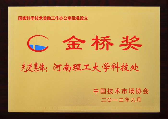 2013第六届“金桥奖”颁奖大会于6月16日在陕西杨凌隆重举行。国务院参事、科技部原副部长刘燕华,科技部原副部长、中国技术市场协会会长韩德乾,中共陕西省委原副书记、中国技术市场协会第一副会长范肖梅等出席会议并为获奖者颁奖。本届金桥奖共评选出先进集体奖258个、先进个人奖347名、优秀项目奖263个,我校科技处荣获第六届“金桥奖”先进集体奖(河南高校2家),这是我校第三次因成果推广转化成绩突出而获奖。科技处副处长马建宏获先进个人奖(河南高校2人),教授管学茂完成的《新型矿物基注浆材料及其应用关键技术攻关与产业化》和教授李凯琦完成的《高性能喷射混凝土制备技术研究》分别获优秀项目奖(河南高校仅此2项)。
