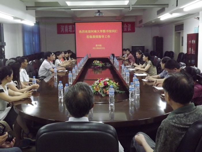 6月5日上午,河南大学图书馆副馆长晁国立,携图书馆同仁一行16人来我校图书馆参观考察,我校图书馆副馆长曾玉凤等班子成员及科室主任与他们在图书馆会议室进行了座谈和交流。