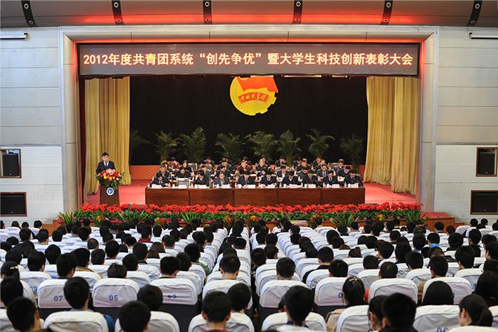 4月23日下午,2012年度共青团系统“创先争优”曁大学生科技创新表彰大会在小礼堂隆重召开。校长邹友峰,校党委副书记周志远,副校长张战营出席会议,党办、校办、组织部、宣传部等职能部门的负责同志和各学院党政领导及七百余名团员青年参加了表彰大会。本次表彰大会由校团委副书记阎俊豪主持。