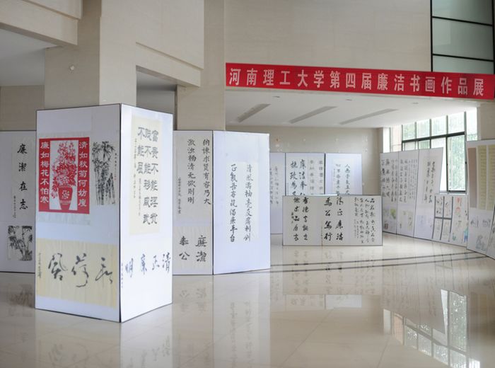 近日,为加强学校廉洁文化建设,弘扬清风正气,净化发展环境,为丰富校园文化生活,营造积极向上、文明和谐的校园文化氛围,河南理工大学第四届廉洁书画作品展在明德楼一楼大厅拉开了序幕。此次书画展得到了全校师生的大力支持,共征集到各单位推荐作品520件,经专家的初步筛选,将主题鲜明、创意新颖、特色突出的优秀作品集中展出,并评出书法类作品一等奖4幅,二等奖9幅,三等奖17幅以及绘画类作品一等奖3幅,二等奖6幅,三等奖15幅。