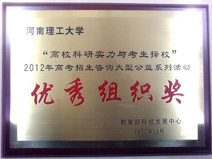 近日,我校接到教育部科技发展中心颁发的“‘高校科研实力与考生择校’—2012年高考招生咨询大型公益系列活动优秀组织奖”奖牌。该奖项是对我校2012年高考招生宣传工作的充分肯定。“高考招生咨询大型公益系列活动”旨在通过各高校对自身的教学、科研能力以及办学理念、专业建设、师资力量、校园环境等进行广泛深入的宣传,服务广大考生正确把握高等教育政策,合理报考高校。