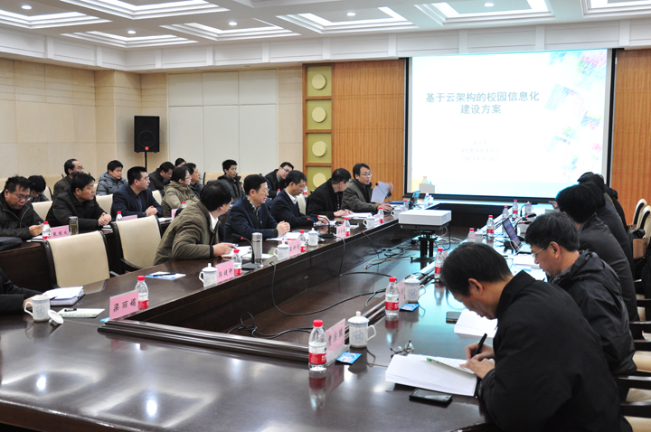 副校长景国勋致欢迎辞,他首先代表学校对专家不辞辛劳在年末岁首来校指导表示热烈欢迎,并向与会专家介绍了学校的发展和校园信息化建设现状。他恳请各位专家对我校校园信息化建设工作精心指导、深入论证、充分讨论、力求实效;同时,真诚感谢各位专家对我校信息化建设等工作给予的指导和帮助。