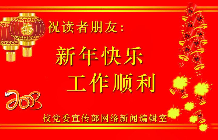 蛟龙呈祥辞旧岁,金蛇起舞闹新春。新年钟声伴随美好祝福飘然而至,岁月如歌裹携幸福愿景悄然来临。作别满载收获的2012年,我们迎来了充满憧憬的2013年。值此辞旧迎新之际,校党委宣传部网络新闻编辑室向长期以来关心和支持学校新闻网的各级领导、海内外各届校友和全校师生员工致以新年的问候和诚挚的祝福!向所有为学校新闻网建设和发展而不懈努力的广大作者和读者朋友表示崇高的敬意和衷心的感谢!祝大家在新的一年里工作顺利、万事如意、阖家欢乐、蛇年吉祥!