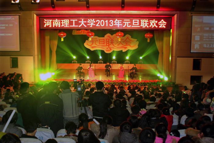 悠扬清越的钟声响彻了小礼堂的上空,热情奔放的歌舞《开门红》拉开了晚会的帷幕,全场顿时洋溢着欢快的节日气氛。活力四射的少儿舞蹈《恰恰style》给在场观众带来无限激情和新春祝福,驱散冬日的寒意。理工情怀装点舞台,红军精神铺展开来,由我校第一届学生歌咏比赛冠军团队计算机学院动情演唱的《河南理工大学校歌》及《过雪山草地》再度袭来。虎虎生威中国风,泱泱华夏民族魂。雄健威猛的武术拳脚生风,行云流水的太极刚柔并济,武术表演《龙腾虎跃》一招一式尽显理工学子青春朝气,博得了现场观众热烈地喝彩,掌声经久不息,将晚会氛围再度推向高潮。青春的倩影,永恒的欢乐,《美丽的心情》带给观众美好的憧憬,柔和的灯光,秀美的舞蹈,缱绻着祝福的情思在舞台上回荡。二胡联奏《奔驰在千里草原上》、《敖包相会》、《赛马》,清晰古朴、乐声悠扬,尽显新年祥和的气息。盛世潮头展才俊,再谱华章;钟灵毓秀显英杰,永续辉煌,朗诵《同一个梦想》气壮山河,激荡人心,于深情朗诵中升华梦想,展现了全校师生要在党的十八大精神的指引下朝着“中国梦”阔步前行的坚强意志,将晚会推向最高潮。深情饱满的歌声绕梁三尺,柔美浪漫的伴舞动人心弦,歌舞《父亲的草原,母亲的河》唤起人们心中真挚的情怀,亲情至深,溢于言表。晚会最后,《欢乐中国年》以动人的旋律印染整个小礼堂的悸动,承载着新的期待与梦想。整场晚会以“喜庆、祥和、高雅”为基调,融合了器乐演奏、独唱、合唱、舞蹈、相声等丰富多彩的节目,集娱乐性、欣赏性为一体,为全校师生献上了一场美轮美奂的视觉盛宴,现场掌声不断,高潮迭起。