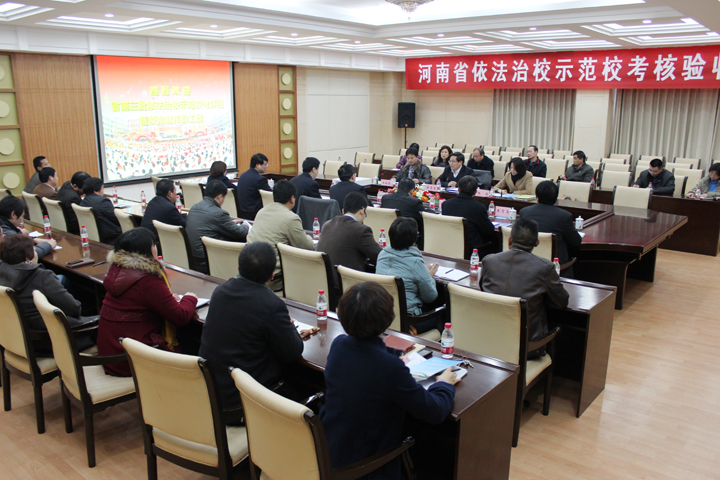 12月18日下午,省依法治校示范校考评专家组莅校对依法治校工作进行检查验收,学校在力行楼方形会议室举行汇报会。考评专家组组长、河南工业大学副校长陈复生,专家组成员、河南升达经贸管理学院副院长张洁,河南大学发展规划处副处长王振存,校长邹友峰、校党委副书记周志远,法制副校长、焦作市中级人民法院刑一庭庭长刘志雷出席会议,学校法律顾问、依法治校工作相关部门负责人参加会议。会议由周志远主持。